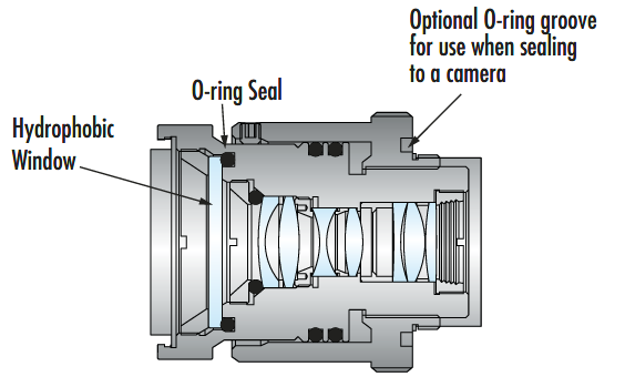 Figure 2: An ingress protected ruggedized lens features an O-ring to seal out contaminants like dust, dirt, or moisture and a hydrophobic window at the front of the optical train.