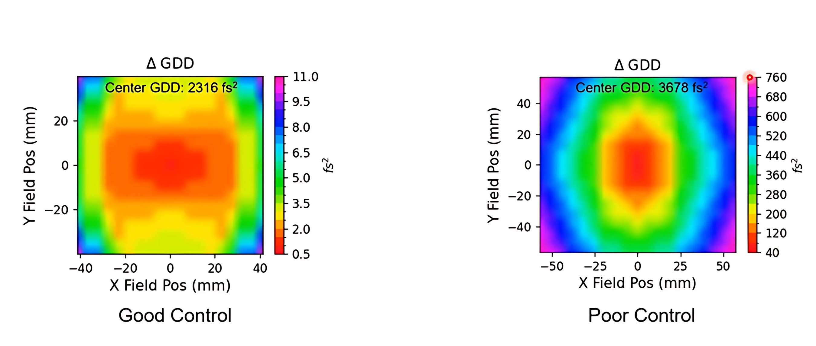 In Figure 13, the system on the left demonstrates excellent uniformity with a center GDD of 2316 fs² and minimal field variations spanning only 0.5 to 11.0 fs². In stark contrast, the system on the right exhibits severe non-uniformity, showing a higher center GDD of 3676 fs² and significant field variations ranging from 40 to 760 fs². This can lead to inconsistent processing throughout the field. These issues are also not possible to pre-compensate for, as they are created by the lens itself.