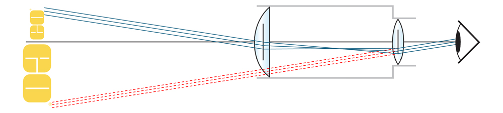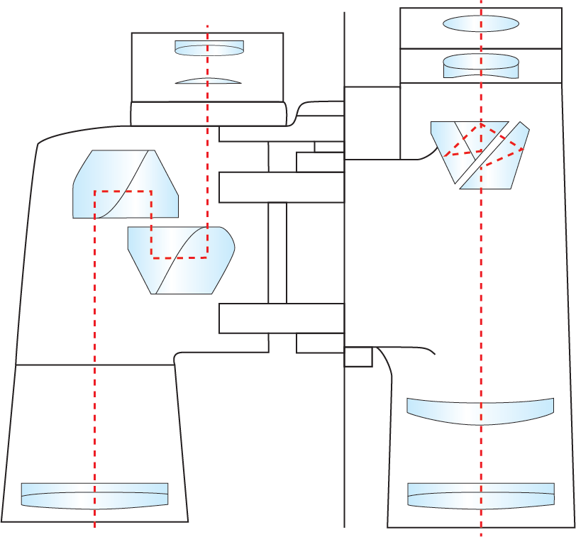 The collinearity of the entrance and exit beams in the Schmidt-Pechan setup allows more compact systems compared to the Double Porro design (Figure 4), making the Schmidt-Pechan prism a very popular choice for modern, compact binoculars.