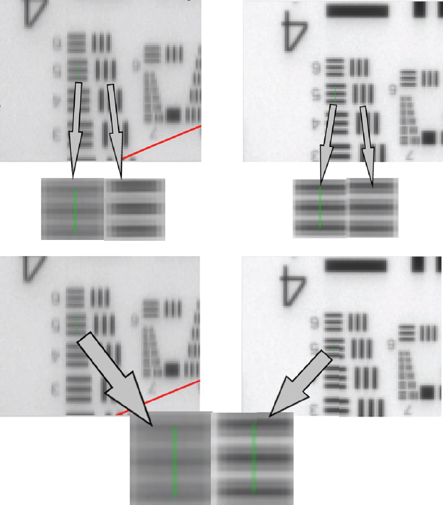 In typical configurations, the light cone of each image point passing through the prism will be recombined in the image plane. The relative phase shift between the two halves will cause interference effects, creating a diffraction pattern, which will result in a degradation of resolution. Notably, this effect occurs only in the axis perpendicular to the roof edge which means it will introduce astigmatism. The distortion can be very easily visualized by taking an image of a USAF target through the individual Schmidt prism (Figure 6, left-hand side). The contrast on the horizontal line pattern is reduced, which is clearly visible in comparison to the vertical pattern. For higher-end applications, this reduction of image quality is not acceptable.