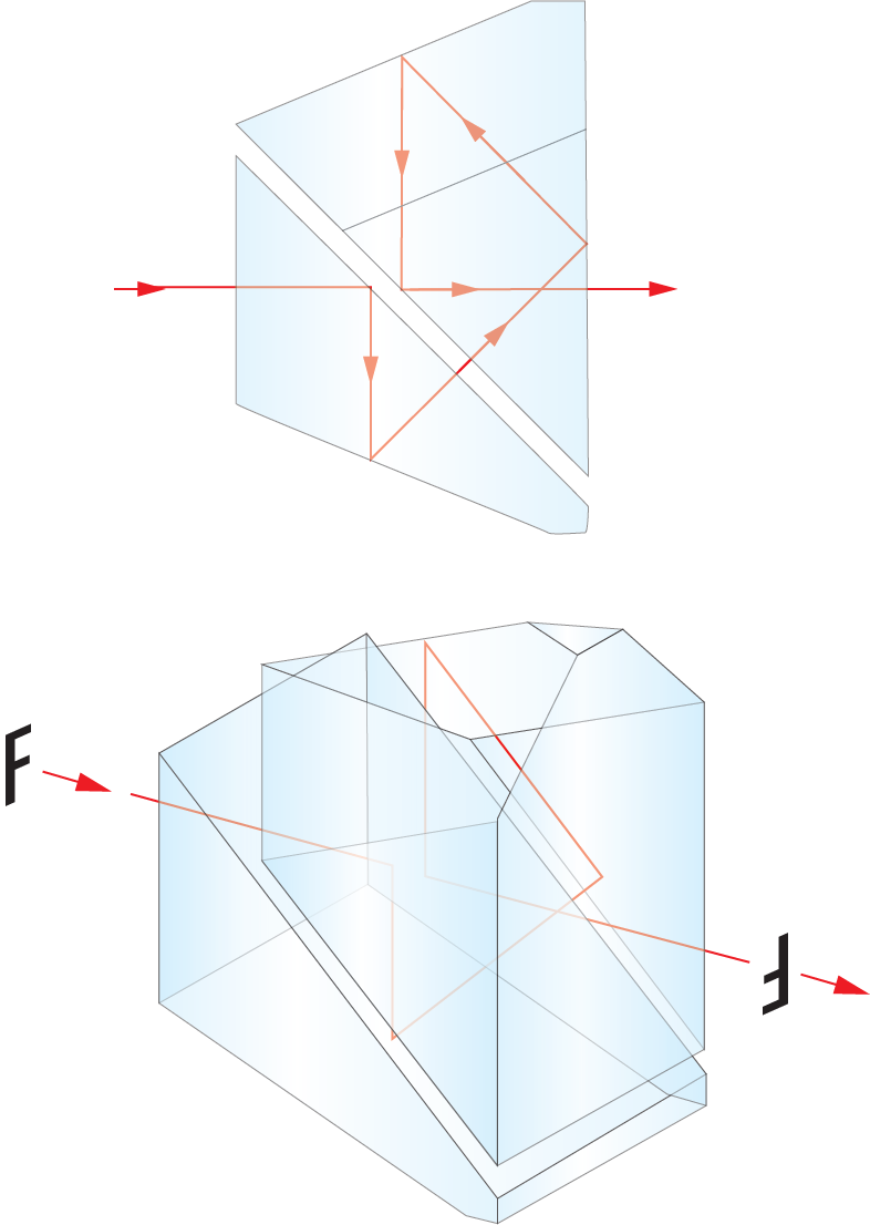 An illustration of this is shown in Figure 5, where the portion of the (diverging) beam that enters the “green” half of the prism is reflected on the back roof surface outlined in green, then falls onto the front roof surface, outlined in red. Light entering the “red” half of the prism will go through in the opposite order. For most given polarization directions of the incident light, the projections of the polarization vector differ between the two surfaces, and so will the induced phase shift when the order of reflection is reversed. Detailed calculations, averaged over all possible polarization directions – as with natural, unpolarized incident light – reveal a net phase shift between the two paths.