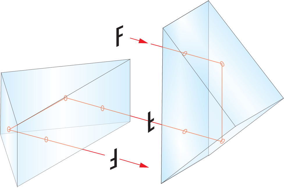 An inverted image may not be a problem for a stationary astronomic telescope, looking at mostly round objects in space, but for taking in the scenery or spotting wildlife, it is clearly not ideal. The solution comes in the form of image rotation prisms, namely the Double Porro (Figure 2) or Schmidt-Pechan design (Figure 3). Although these assemblies look very different, they both use a combination of internal reflections to create a 180° image rotation, which can compensate for the inversion in the telescope setup.