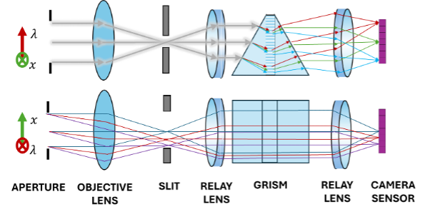 FINCH EYE employs a push-broom hyperspectral imaging architecture, as illustrated in Figure 2. In this approach, the satellite images a single stripe on the Earth’s surface and disperses light into its spectral components along the perpendicular axis of the camera sensor. The satellite scans across the Earth’s surface as it orbits, thus acquiring a hyperspectral “datacube” with two spatial axes and one spectral axis of information. Within FINCH EYE, this is implemented with a commercial objective lens that images the Earth, a slit which “selects” one stripe on the ground, and a dispersive lens – grating – lens relay that reimages light from the slit onto the camera sensor.