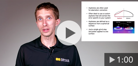 TECHSPEC® UV Fused Silica Aspheric Lenses offer the benefits of an aspheric element combined with the manufacturing precision of state-of-the-art grinding and polishing equipment. These fused silica optics can be easily designed and integrated into complex optical systems with the available prescription data. Featuring low f/#’s, which allow for a larger aperture and thus more light gathering and focusing performance, these fused silica lenses are computer-optimized to eliminate spherical and minimize higher order aberrations. TECHSPEC® UV Fused Silica Aspheric Lenses offer a low coefficient of thermal expansion, making them ideal for applications in metrology, beam-focusing or collimating, and OEM integration. These lenses are available in a variety of coating options and are offered in sizes ranging from 10-50mm.